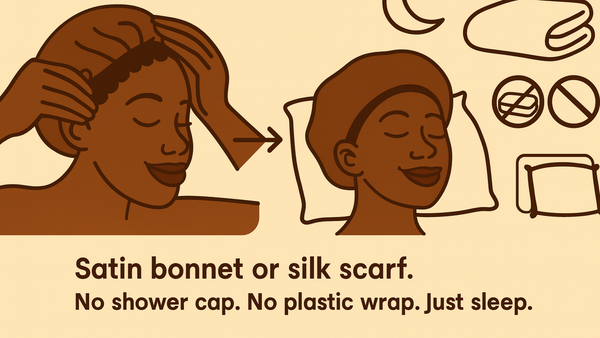 Satin bonnet or silk scarf. (Your pillow stays clean even without it, but we're not testing fate.) That's it. You're done. No shower cap. No plastic wrap. No 2-hour wait. Just sleep.